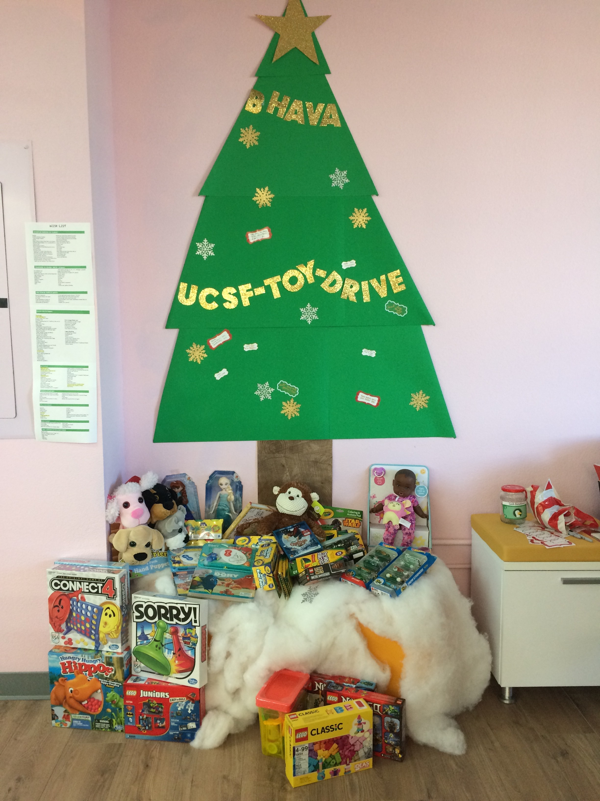 At the foot of the tree, you’ll find boxes of crayons, colored pencils, dolls, stuffed animals and more. Although I don’t doubt some Bhavans could take a well-deserved break with Play-Doh and and LEGO bricks, the toys aren’t for us. This holiday season, we’re having a donation drive for the UCSF Benioff Children’s Hospital in Oakland. The toys will be used as part of patients’ treatment plans and as gifts following their procedures or to celebrate a special event (birthday, holiday, end of treatment, etc.). The hope is that these toys can help put infants, children and young adults more at ease during their time at the hospital. Next to the tree, you’ll find a wishlist naming preferred gifts for children of all ages as well as a jar for cash donations. We’ve achieved our goal of $500 worth of donations, and we’re still going.
